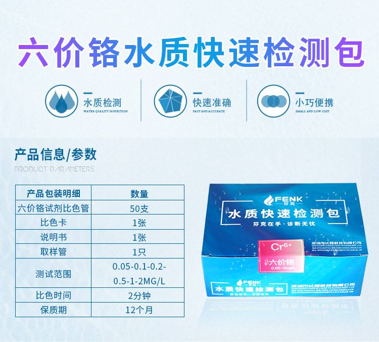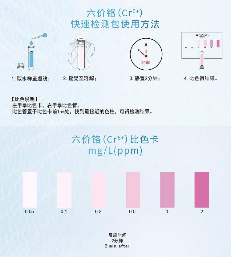 2.本產(chǎn)品檢測水中六價(jià)鉻(Cr)含量在0.05-2mg/L(ppm)范圍內(nèi),若要檢測2mg/L以上濃度水樣,請預(yù)先稀釋水樣后再進(jìn)行測定,具體操作見稀釋說明書。