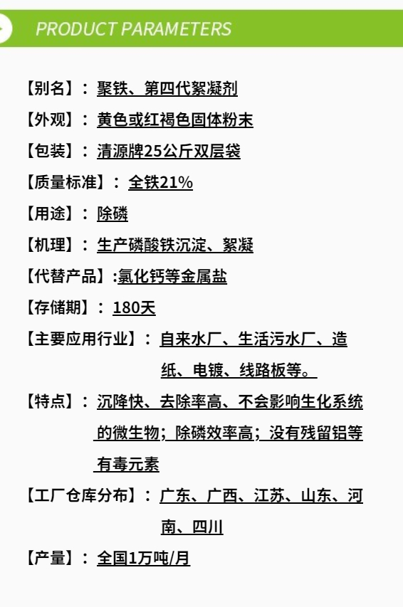 清源牌聚合硫酸鐵與硫酸亞鐵廣泛用于城鎮生活飲用水、工業循環水的凈化處理,化工、石油、礦山、造紙、印染、釀造、鋼鐵、煤制氣、油漆、皮革、制藥、食品、電鍍等行業的工業廢水和城市生活污水的凈化、污泥脫水處理。