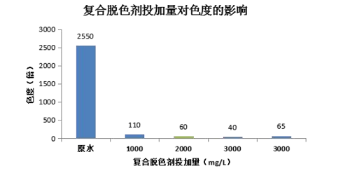 通過(guò)小試數(shù)據(jù),在 pH 值為 8 的情況下,最終選擇濃度為 2000mg/L 的復(fù)合脫色劑,可將色度降至 60,同比客戶現(xiàn)場(chǎng)的脫色劑+聚鋁投加量 3000mg/L,噸水藥劑投加量節(jié)省 0.7-1.1kg,可達(dá)到色度 100 的排放標(biāo)準(zhǔn)以下,脫色效果更佳。